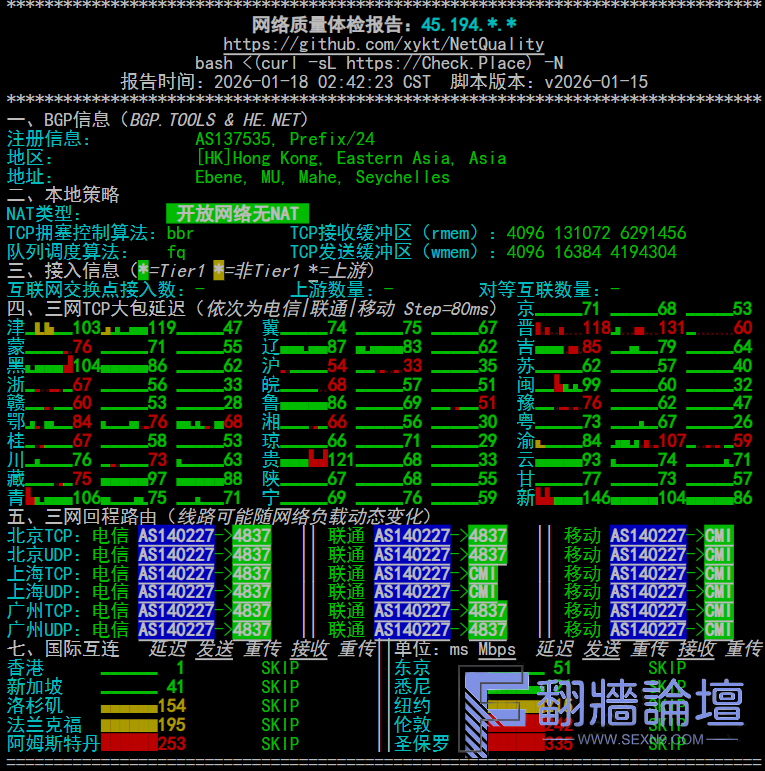 三网回程路由(线路可能随网络负载动态变化) 北京 电信 AS140227 -> 4837 地理路径:香港 -> 上海 -> 北京 自治系统路径:AS140227 -> AS4837 -> AS4134 -> AS4847 1 13.64ms 45.194.*.* AS140227 中国 香港 udc.hk 4 0.66ms 10.1.*.* * RFC1918 10 53.21ms 219.158.*.* AS4837 [CU169-BACKBONE] 中国 上海 chinaunicom.cn 联通 11-14 54.74ms 219.158.*.* AS4837 [CU169-BACKBONE] 中国 北京市 chinaunicom.cn 15 69.94ms 202.97.*.* AS4134 [CHINANET-BB] 中国 北京 chinatelecom.com.cn 电信 17 70.81ms 36.112.*.* AS4847 中国 北京 bj.189.cn 18-19 75.28ms 219.141.*.* AS4847 [CHINATELECOM-BJ] 中国 北京 bj.189.cn 20 74.69ms 106.37.*.* AS4847 [CHINANET-HN] 中国 北京 bj.189.cn 北京 联通 AS140227 -> 4837 地理路径:香港 -> 上海 -> 北京 自治系统路径:AS140227 -> AS4837 -> AS4808 1 8.48ms 45.194.*.* AS140227 中国 香港 udc.hk 4 0.57ms 10.1.*.* * RFC1918 10-12 71.90ms 219.158.*.* AS4837 [CU169-BACKBONE] 中国 上海 chinaunicom.cn 联通 13 67.13ms 219.158.*.* AS4837 [CU169-BACKBONE] 中国 北京 chinaunicom.cn 联通 14 68.13ms 125.33.*.* AS4808 [UNICOM-BJ] 中国 北京 www.bbn.com.cn 联通 15 87.51ms 61.148.*.* AS4808 [UNICOM-CN] 中国 北京市 www.bbn.com.cn 联通 19 69.10ms 221.222.*.* AS4808 [UNICOM-BJ] 中国 北京 海淀 www.bbn.com.cn 北京 移动 AS140227 -> CMI 地理路径:香港 -> 北京 自治系统路径:AS140227 -> AS58453 -> AS9808 -> AS56048 1 7.57ms 45.194.*.* AS140227 中国 香港 udc.hk 3-4 3.13ms 10.2.*.* * RFC1918 9-11 153.53ms 223.119.*.* AS58453 [CMI-INT] 中国 香港 cmi.chinamobile.com 13-16 52.54ms 221.183.*.* AS9808 [CMNET] 中国 北京 X-I chinamobileltd.com 移动 19-22 54.34ms 211.136.*.* AS56048 [CMNET] 中国 北京 bj.10086.cn 移动 24 53.93ms 211.136.*.* AS56048 [CMNET] 中国 北京 bj.10086.cn 移动 上海 电信 AS140227 -> 4837 地理路径:香港 -> 上海 自治系统路径:AS140227 -> AS4837 -> AS4134 -> AS4812 1 3.32ms 45.194.*.* AS140227 中国 香港 udc.hk 2-4 8.37ms 10.3.*.* * RFC1918 10-11 52.55ms 219.158.*.* AS4837 [CU169-BACKBONE] 中国 上海 chinaunicom.cn 联通 12 58.12ms 219.158.*.* AS4837 [CU169-BACKBONE] 中国 北京 北京 chinaunicom.cn 14 52.74ms 202.97.*.* AS4134 [CHINANET-BB] 中国 上海 chinatelecom.com.cn 电信 15 55.27ms 101.95.*.* AS4812 [CHINANET-SH] 中国 上海 chinatelecom.cn 电信 21 54.68ms 101.226.*.* AS4812 [CHINANET-SH] 中国 上海市 chinatelecom.cn 电信 上海 联通 AS140227 -> CMI 地理路径:香港 -> 上海 自治系统路径:AS140227 -> AS58453 -> AS9808 -> AS140979 1 7.58ms 45.194.*.* AS140227 中国 香港 udc.hk 4 0.57ms 10.1.*.* * RFC1918 9-11 153.58ms 223.119.*.* AS58453 [CMI-INT] 中国 香港 cmi.chinamobile.com 13-19 37.81ms 221.183.*.* AS9808 [CMNET] 中国 上海 X-I chinamobileltd.com 移动 27 33.40ms 112.64.*.* AS140979 [APNIC-AP] 中国 上海市 闵行 chinaunicom.cn 联通 上海 移动 AS140227 -> CMI 地理路径:香港 -> 上海 自治系统路径:AS140227 -> AS58453 -> AS9808 1 7.71ms 45.194.*.* AS140227 中国 香港 udc.hk 2-4 10.99ms 10.3.*.* * RFC1918 9-11 153.21ms 223.119.*.* AS58453 [CMI-INT] 中国 香港 cmi.chinamobile.com 13-17 37.75ms 221.183.*.* AS9808 [CMNET] 中国 上海 X-I chinamobileltd.com 移动 21 35.04ms 117.185.*.* AS9808 [CMNET] 中国 上海市 chinamobileltd.com 移动 广东 电信 AS140227 -> 4837 地理路径:香港 -> 上海 -> 北京 -> 广东 自治系统路径:AS140227 -> AS4837 -> AS4134 1 13.60ms 45.194.*.* AS140227 中国 香港 udc.hk 4 0.79ms 10.1.*.* * RFC1918 10 54.29ms 219.158.*.* AS4837 [CU169-BACKBONE] 中国 上海 chinaunicom.cn 联通 11-14 54.56ms 219.158.*.* AS4837 [CU169-BACKBONE] 中国 北京市 chinaunicom.cn 15 67.62ms 202.97.*.* AS4134 [CHINANET-BB] 中国 北京 chinatelecom.com.cn 电信 16 72.19ms 202.97.*.* AS4134 [CHINANET-BB] 中国 广东 广州 chinatelecom.com.cn 电信 23 74.84ms 183.47.*.* AS4134 [APNIC-AP] 中国 广东省 广州市 chinatelecom.com.cn 电信 广东 联通 AS140227 -> 4837 地理路径:香港 -> 上海 -> 北京 -> 广东 自治系统路径:AS140227 -> AS4837 -> AS136958 1 12.20ms 45.194.*.* AS140227 中国 香港 udc.hk 3-4 3.39ms 10.2.*.* * RFC1918 10 56.08ms 219.158.*.* AS4837 [CU169-BACKBONE] 中国 上海 X-I chinaunicom.cn 联通 11 53.96ms 219.158.*.* AS4837 [CU169-BACKBONE] 中国 chinaunicom.cn 联通 12 73.15ms 219.158.*.* AS4837 [CU169-BACKBONE] 中国 北京市 chinaunicom.cn 13 76.79ms 219.158.*.* AS4837 [CU169-BACKBONE] 中国 广东 广州 chinaunicom.cn 联通 20 57.32ms 157.148.*.* AS136958 [UNICOM-GD] 中国 广东省 广州市 chinaunicom.cn 联通 广东 移动 AS140227 -> CMI 地理路径:香港 -> 广东 自治系统路径:AS140227 -> AS58453 -> AS9808 -> AS56040 1 9.12ms 45.194.*.* AS140227 中国 香港 udc.hk 2-4 6.64ms 10.3.*.* * RFC1918 9-11 153.40ms 223.119.*.* AS58453 [CMI-INT] 中国 香港 cmi.chinamobile.com 13-17 13.26ms 221.183.*.* AS9808 [CMNET] 中国 广东 广州 X-I chinamobileltd.com 移动 19 17.03ms 211.136.*.* AS56040 [CMNET] 中国 广东 广州 gd.10086.cn 移动 20-22 19.49ms 183.235.*.* AS56040 [APNIC-AP] 中国 广东 广州 gd.10086.cn 移动 25 23.68ms 211.139.*.* AS56040 [CMNET] 中国 广东 广州 gd.10086.cn 移动 ================================================================================VPSVPN vpsxb.net 原创, 转载请注明出处.小结