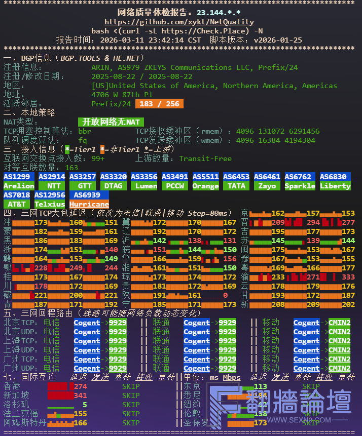 ######################################################################## IP质量体检报告:23.144.*.* https://github.com/xykt/IPQuality bash <(curl -sL https://Check.Place) -I 报告时间:2026-03-11 23:40:16 CST 脚本版本:v2026-03-05########################################################################一、基础信息(Maxmind 数据库)自治系统号: AS174组织: Cogent Communications, LLC使用地: [US]美国注册地: [US]美国IP类型: 原生IP 二、IP类型属性数据库: IPinfo ipregistry ipapi IP2Location AbuseIPDB 使用类型: 商业 商业 机房 组织 商业 公司类型: 机房 机房 家宽 机房 三、风险评分风险等级: 极低 低 中等 高 极高IP2Location: 0|低风险Scamalytics: 0|低风险ipapi: 0.00%|极低风险AbuseIPDB: 0|低风险IPQS: 75|可疑IPDB-IP: |低风险四、风险因子库: IP2Location ipapi ipregistry IPQS Scamalytics ipdata IPinfo IPWHOIS地区: [US] [US] [US] [US] [US] [US] [US] [US]代理: 否 否 否 是 否 否 否 无 Tor: 否 否 否 否 否 否 否 无 VPN: 否 否 否 是 否 无 否 无 服务器: 否 否 是 无 否 否 是 无 滥用: 否 否 否 否 否 否 无 无 机器人: 否 否 无 否 否 无 无 无 五、流媒体及AI服务解锁检测服务商: TikTok Disney+ Netflix Youtube AmazonPV Reddit ChatGPT 状态: 解锁 解锁 解锁 解锁 解锁 解锁 解锁 地区: [US] [US] [US] [US] [US] [US] [US] 方式: 原生 原生 原生 原生 原生 原生 原生 六、邮局连通性及黑名单检测本地25端口出站:阻断通信:远端25端口不可达IP地址黑名单数据库: 有效 439 正常 417 已标记 22 黑名单 0========================================================================VPSVPN vpsxb.net 原创, 转载请注明出处.路由